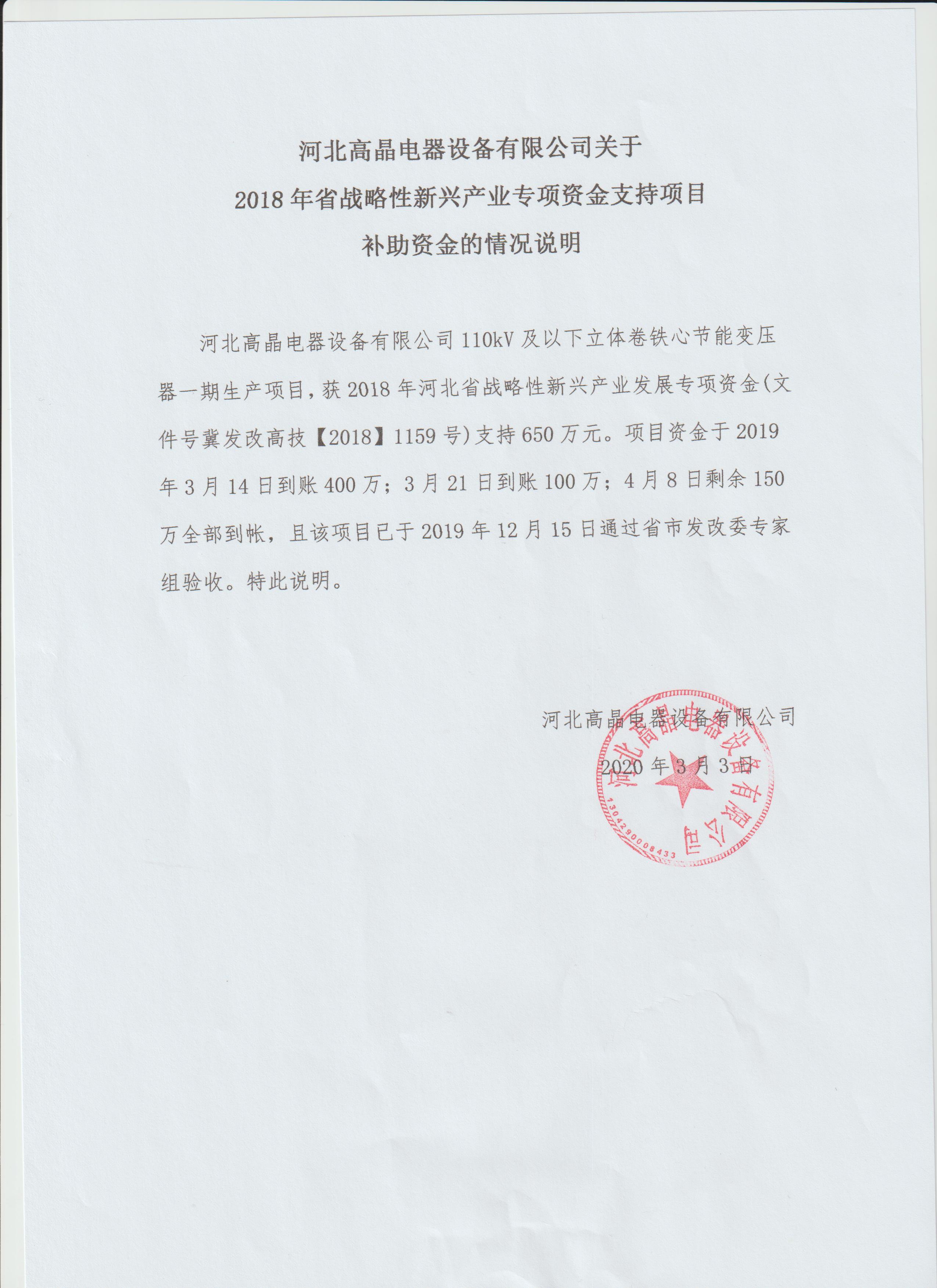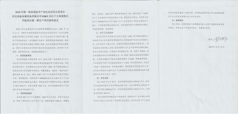 根據(jù)《河北省高技術(shù)產(chǎn)業(yè)發(fā)展項(xiàng)目管理暫行辦法》,2019年12月15日,邯鄲市發(fā)展和改革委員會(huì)在永年區(qū)組織召開(kāi)了由河北高晶電器設(shè)備有限公司承擔(dān)的110kV及以下立體卷鐵心節(jié)能變壓器一期生產(chǎn)項(xiàng)目(年產(chǎn)2000MVA S13型110kV及以下立體卷鐵心節(jié)能變壓器)驗(yàn)收會(huì)。會(huì)議邀請(qǐng)技術(shù)、經(jīng)濟(jì)專家組成驗(yàn)收組,驗(yàn)收組聽(tīng)取了項(xiàng)目工程竣工報(bào)告、技術(shù)總結(jié)報(bào)告和財(cái)務(wù)決算報(bào)告,審閱了財(cái)務(wù)專項(xiàng)審計(jì)報(bào)告及有關(guān)驗(yàn)收材料,并考察了項(xiàng)目現(xiàn)場(chǎng)。經(jīng)質(zhì)詢和討論,該項(xiàng)目完成了各項(xiàng)建設(shè)內(nèi)容,達(dá)到了批復(fù)的總體目標(biāo)和要求,同意通過(guò)驗(yàn)收。