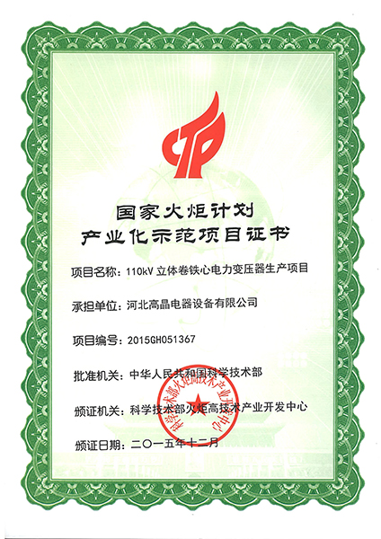 國家火炬計劃產(chǎn)業(yè)化項目證書